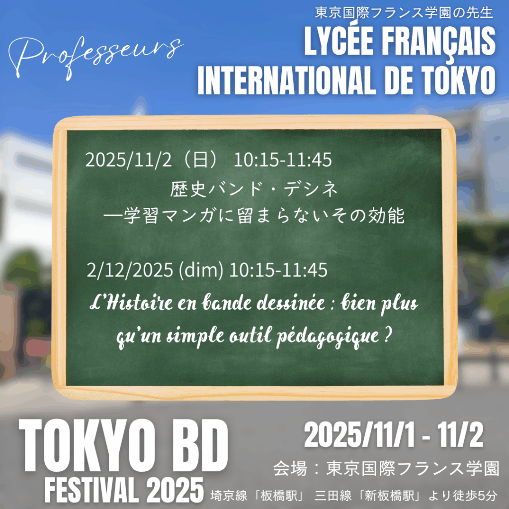 At the Tokyo Comic Festival, on Sunday, 2 November 2025, from 10:15 to 11:45 a.m., we will have the pleasure of welcoming three teachers from the Lycée Français International de Tokyo to the round table discussion ‘Historical Comics: Much More than Educational Manga’.